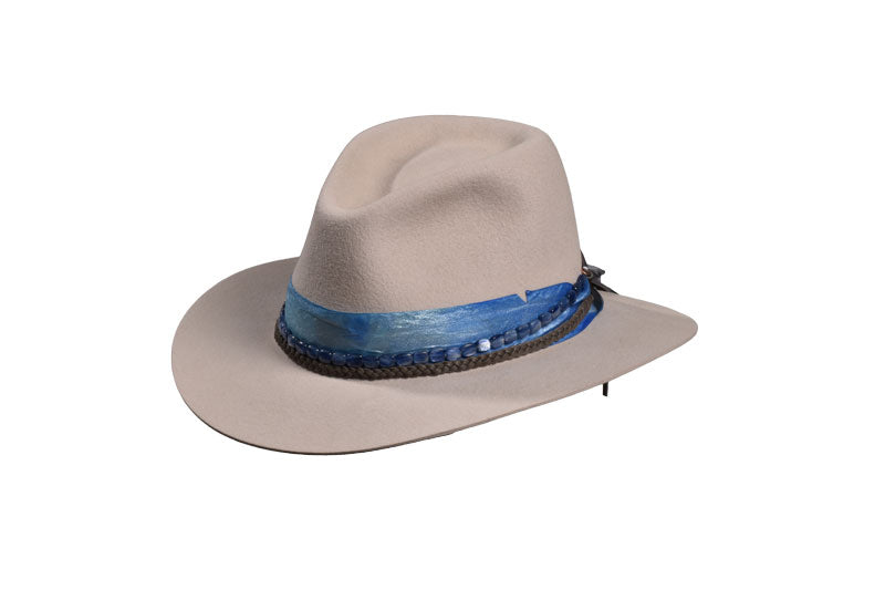 Delicate yet powerful, this silver fedora is handcrafted from European hare felt, giving it a smooth, lightweight finish with lasting durability. The wide brim and soft fedora crown create a flattering shape, while the hatband is layered with glistening kyanite stones and a touch of hand painted silk ribbon.